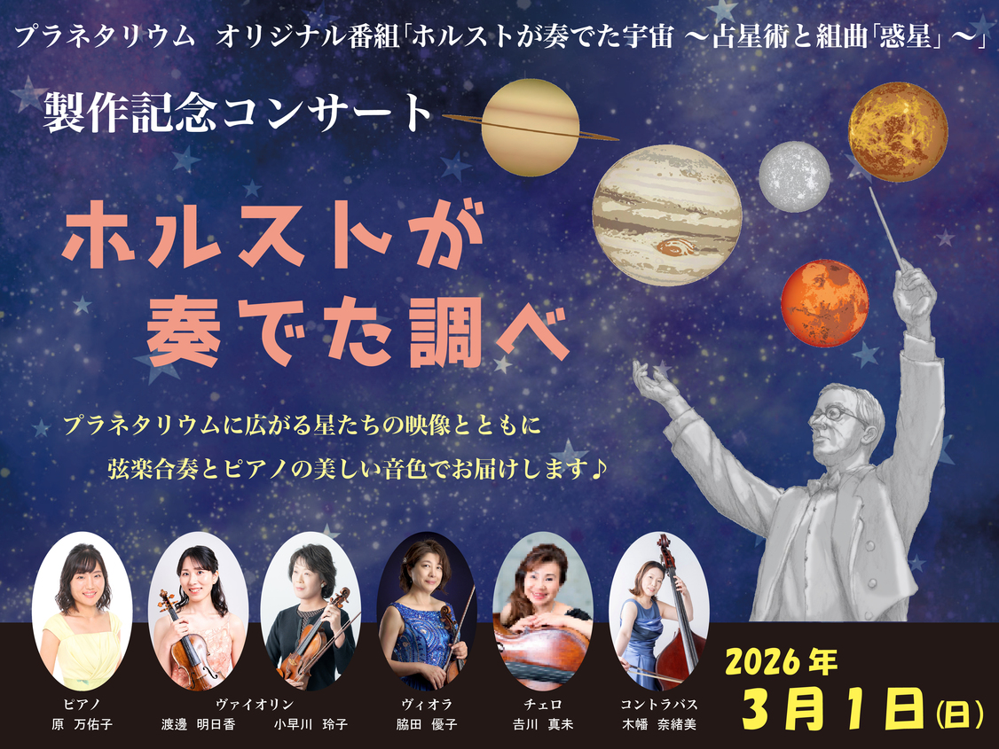 プラネタリウム新オリジナル番組「ホルストが奏でた宇宙 ~占星術と組曲『惑星』~」の製作を記念して生演奏によるコンサートを実施します。