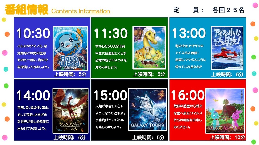 当館スタッフの生解説による「星空解説番組」や独自企画による「オリジナル番組」を上映しているほか、こども向けにアニメーションキャラクターが登場し、楽しく学べる「こども番組」などプログラムも豊富に上映しています。