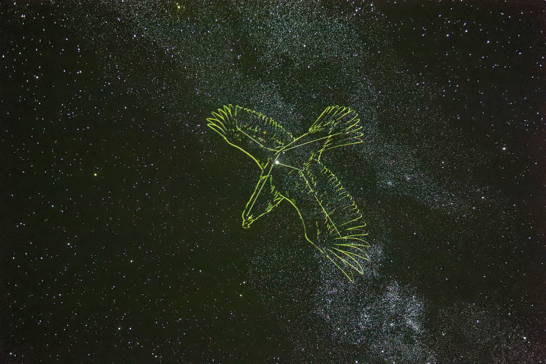 南の低い空には赤っぽい色をした1等星アンタレスと釣り針のような星並びが特徴的なさそり座が見えています。さそり座の東側辺りに見える天の川を空高くへたどっていくと、東の空には、3つの1等星・こと座のベガ、わし座のアルタイル、はくちょう座のデネブがあります。それらを結んでできるのが「夏の大三角」です。